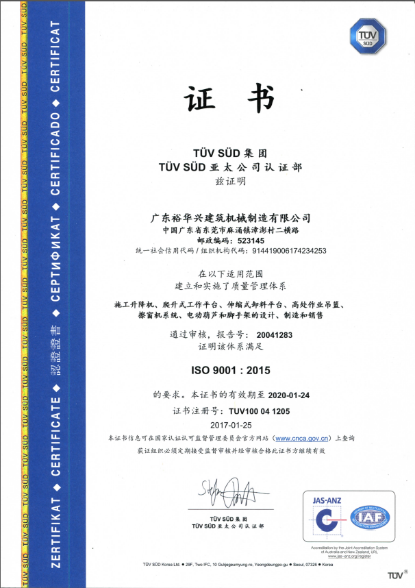 2016年12月,我公司通过通过TUV质量管理认证体系最新的ISO9001:2015认证。
